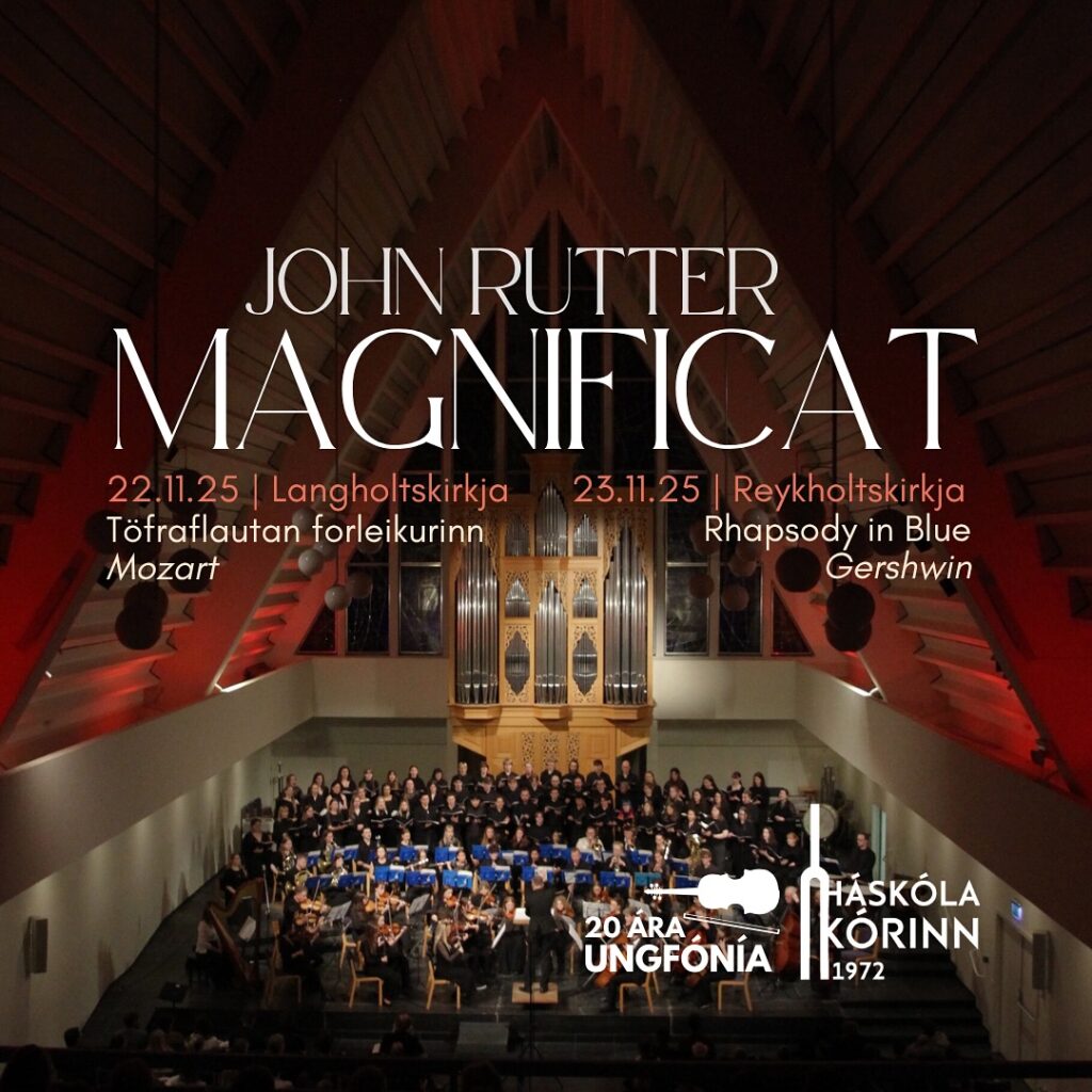 The program includes three works: Mozart’s Overture to The Magic Flute, Gershwin’s Rhapsody in Blue, and John Rutter’s Magnificat. The piano soloist is Anna Þórhildur Gunnarsdóttir and the soprano soloist is Hanna Ágústa Olgeirsdóttir. The conductor is Gunnsteinn Ólafsson.